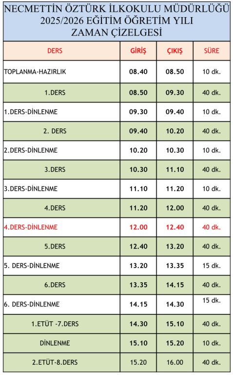 Okulumuz 2025-2026 yılı ders zaman çizelgesi