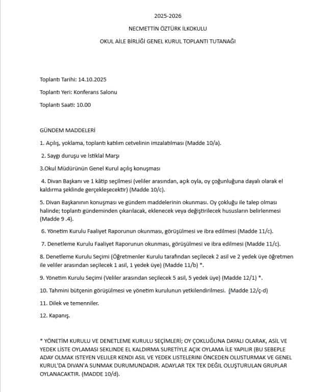 Okul Aile Birliğimizin yıllık olağan genel kurul toplantısı 14 Ekim 2025 Salı günü saat 10:00' da okulumuzun konferans salonunda aşağıdaki gündem maddelerine göre yapılacaktır.